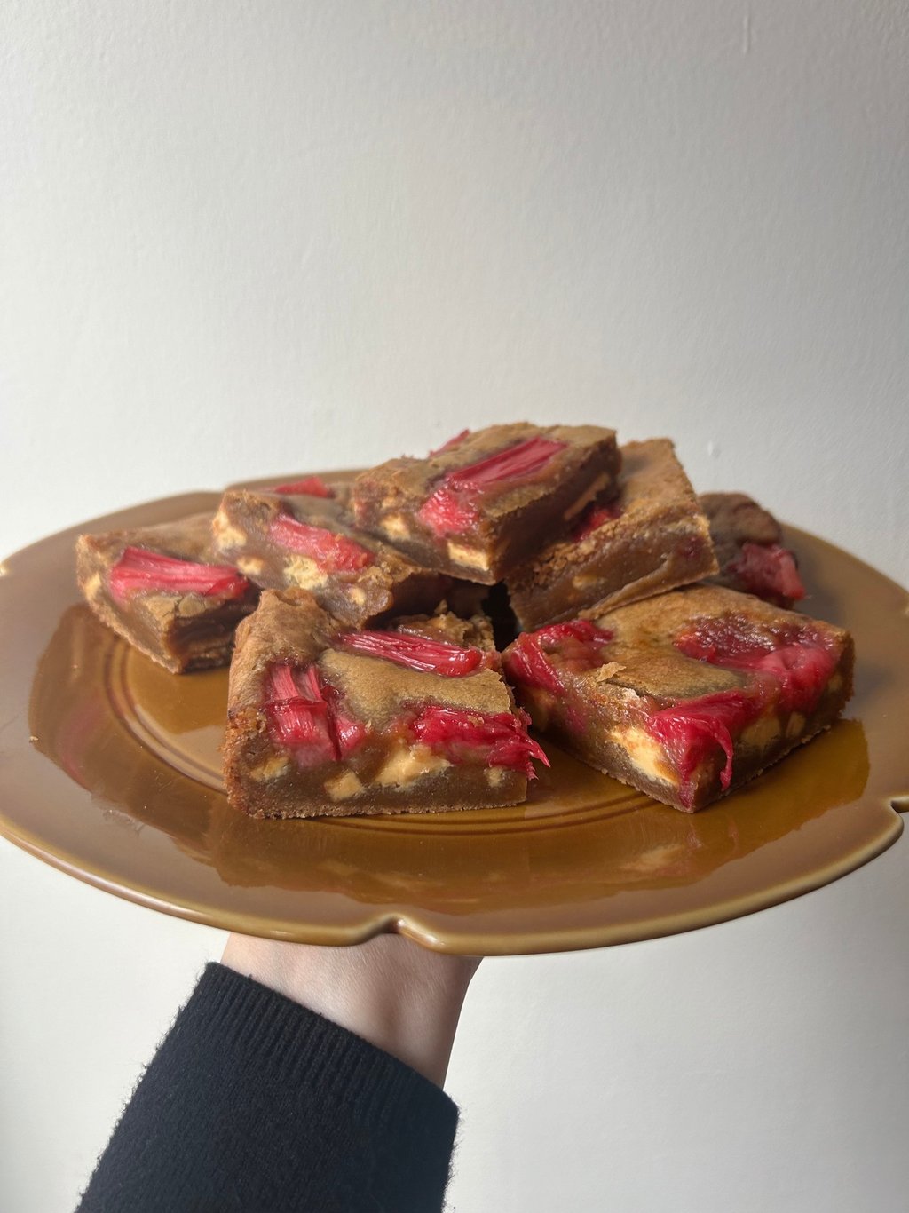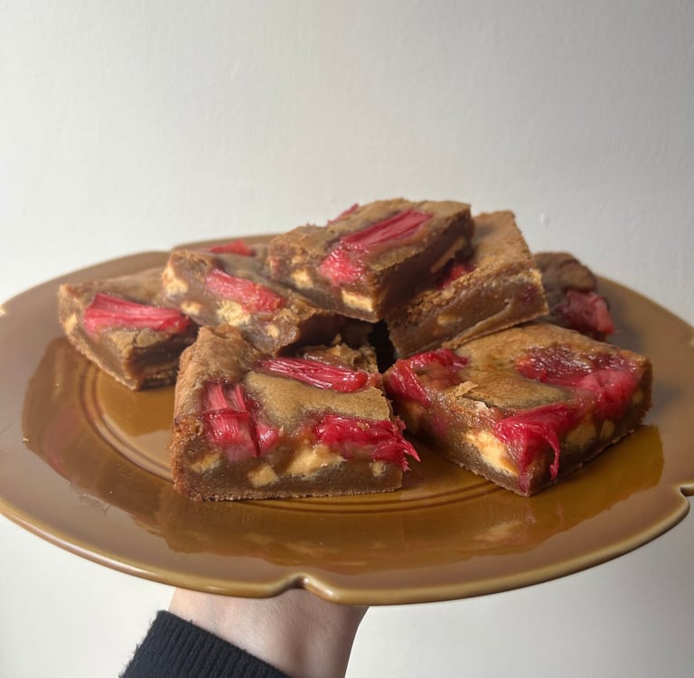 Caramelised white chocolate blondies with seasonal fruit e.g. rhubarb, raspberry
