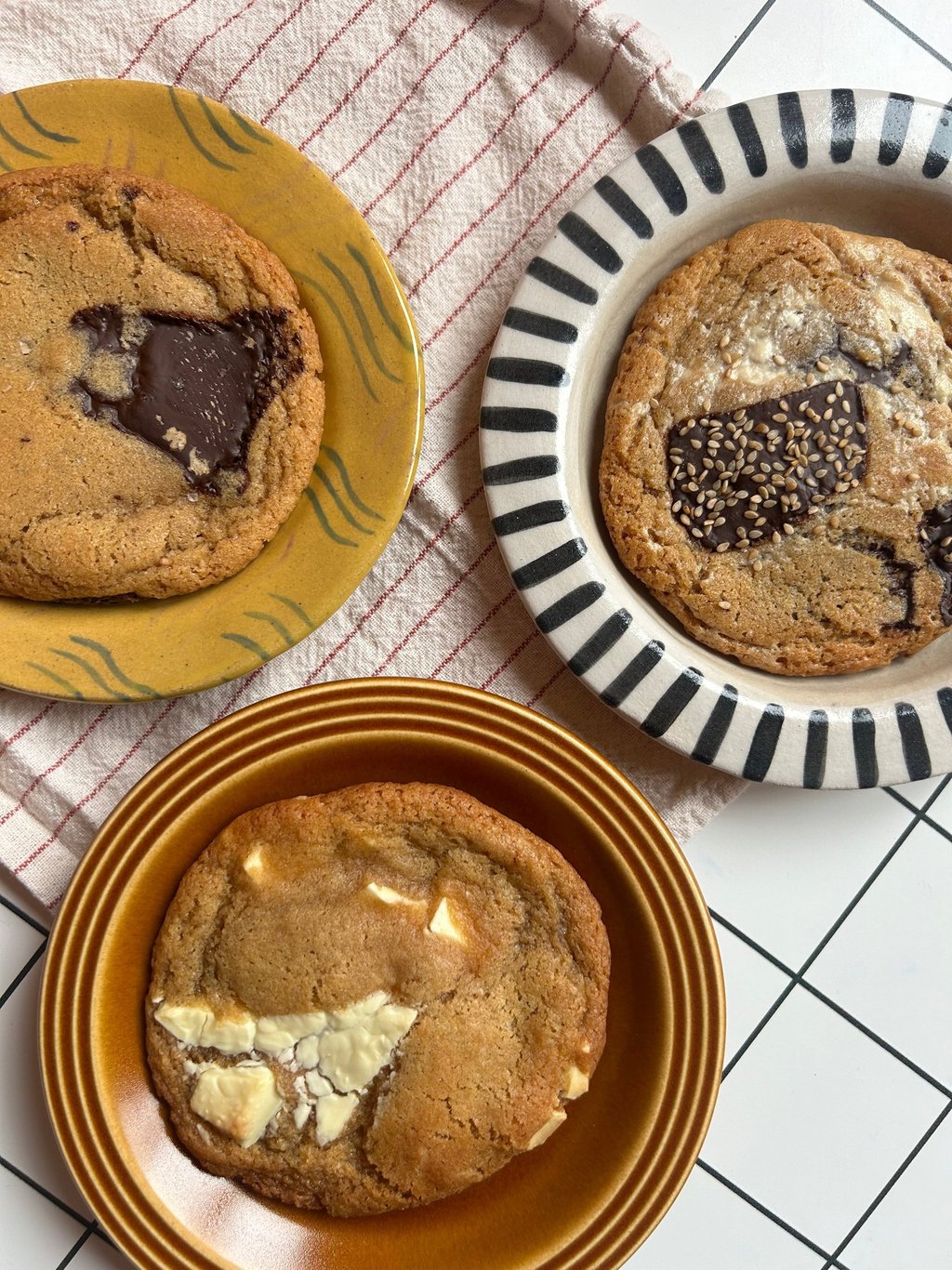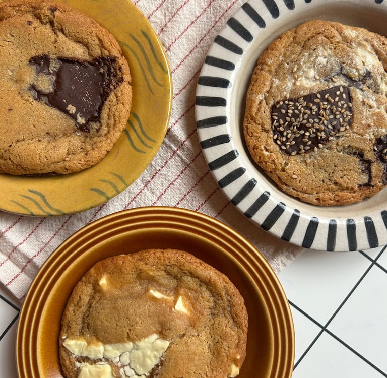Cookies e.g. dark chocolate & halva, white chocolate, hazelnut & smoked salt, chocolate orange (vegan options available)